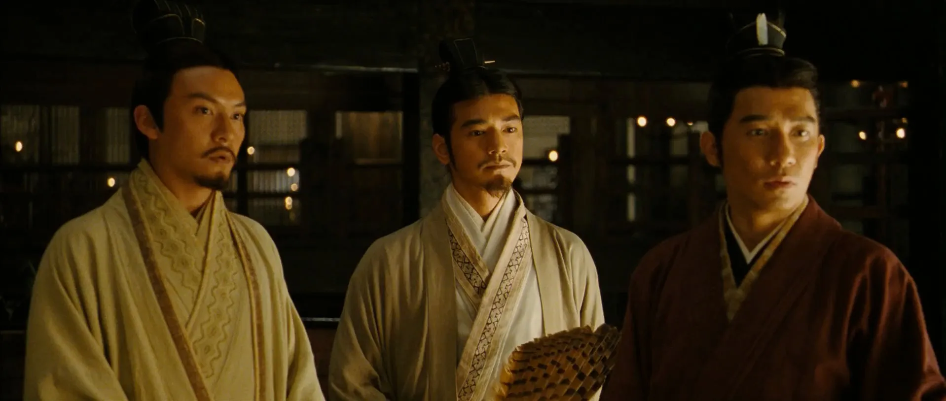 Actors: Tony Leung Chiu-wai as Zhou Yu, Takeshi Kaneshiro as Zhuge Liang, Zhang Feng Yi as Cao Cao, Chang Chen as Sun Quan, Zhao Wei as Sun Shangxiang, Hu Jun as Zhao Yun, Shidô Nakamura as Gan Xing, Chi-Ling Lin as Xiao Qiao, You Yong as Liu Bei, Hou Yong as Lu Su, Tong Dawei as Sun Shucai, Song Jia as Li Ji, Mijid Baasanjav as Guan Yu, Jinsheng Zang as Zhang Fei, Zhang Shan as Huang Gai, Wang Qingxiang as Kong Rong, Wang Hui as Cao Hong, Xie Gang as Hua Tuo, Shi Xiao-Hong as Jiang Gan, Xu Fengnian as Zhang Liao, Guo Chao as Yue Jin, Hu Xiaoguang as Xiahou Jun, Cui Yu-Gui as Xu Chu, Jiang Tong as Li Tong, Ma Jingjing as Wei Ben, Zhen Yi as Cai Mao, Jia Hongwei as Zhang Yun, Zhao Cheng-Shun as Xun You, Zhang You as Soldier